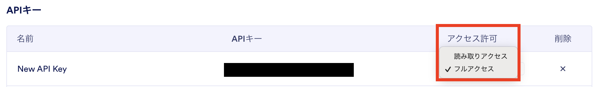 作成したAPIキーのアクセス許可を「フルアクセス」に設定します。