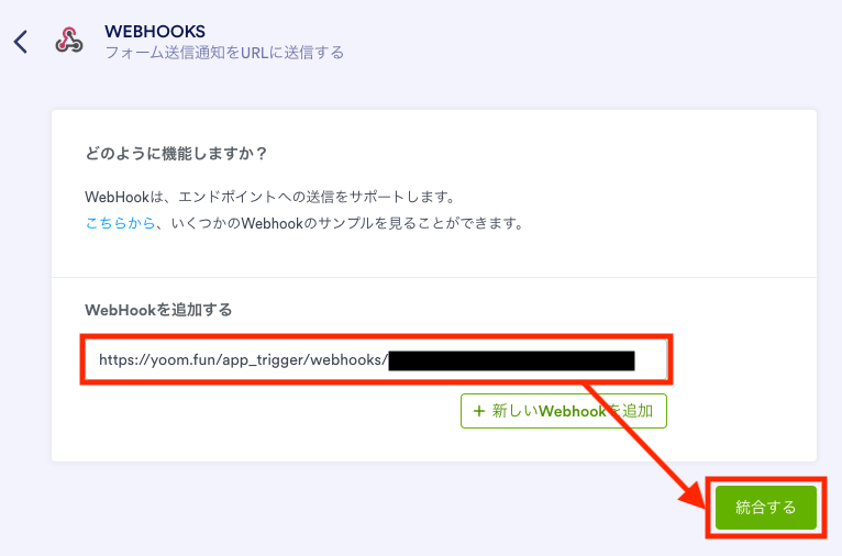 以下の画面が表示されたら、先ほどコピーしたWebhookURLを「WebHookを追加する」の入力欄に貼り付けます。