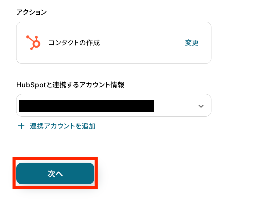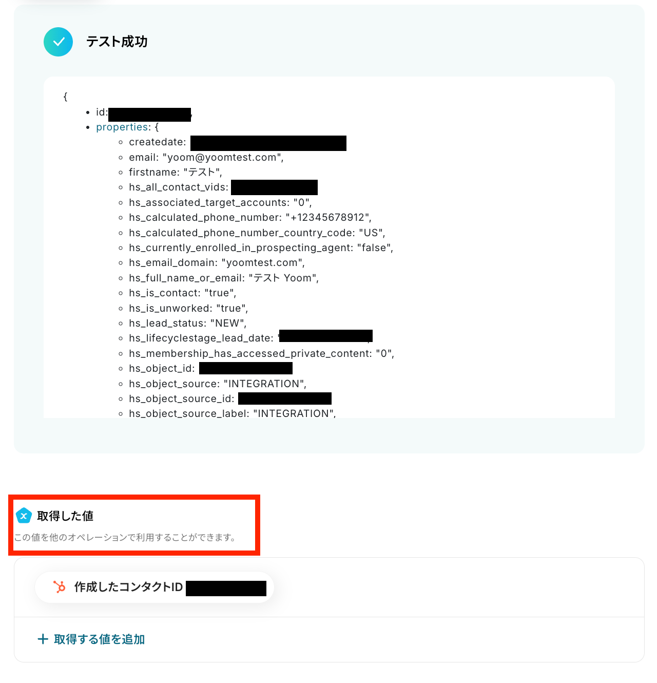 これまでのステップで取得した値を活用して、HubSpotのコンタクトを追加します。
