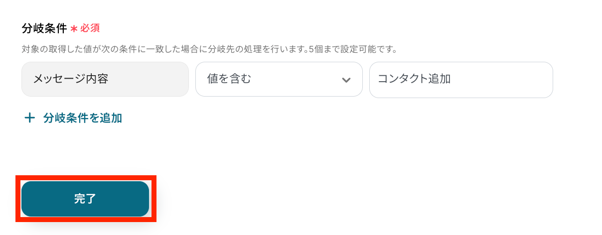 分岐条件も「値を含む」と送信したテキストのキーワードが設定されていることが確認できたら、「完了」をクリックして、分岐条件の設定は終了です。