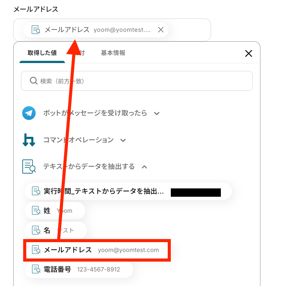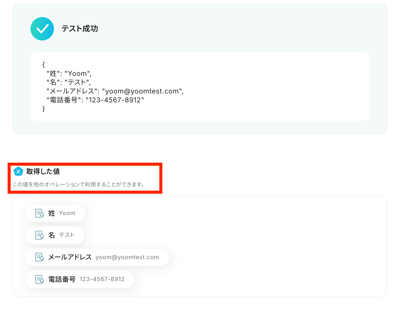 「テスト成功」と表示がされたら、抽出された項目が取得した値に反映されています。