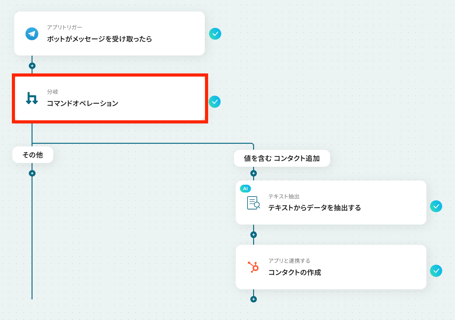 Telegramの投稿をトリガーにして、HubSpotなどのCRMに自動で顧客情報などを登録することができます。