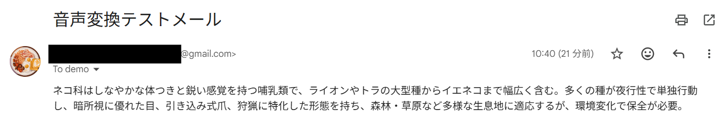 今回は音声変換を行いたいメールとして、以下のようなメールを用意し、あらかじめOutlookのメールアドレス宛てに送信しています。