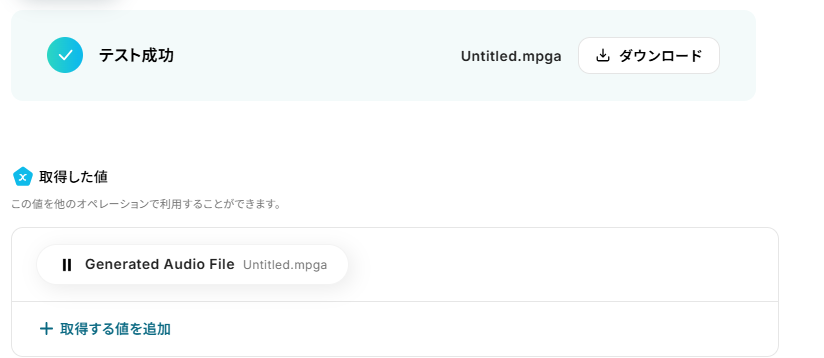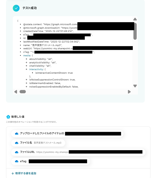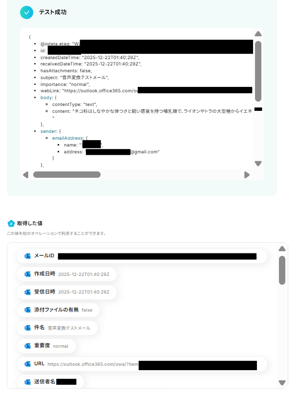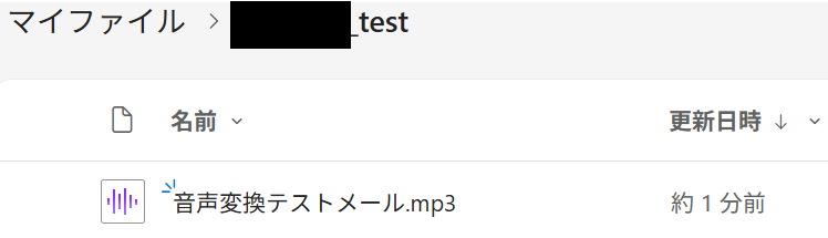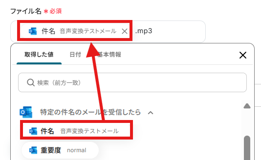 今回、ファイル名は取得した値より件名を参照し、「音声変換テストメール.mp3」としています。