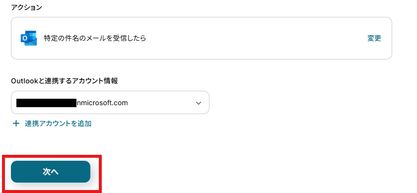 - 次に、トリガーでOutlookを選択し、「特定の件名のメールを受信したら」アクションを設定します。