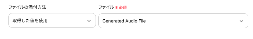- ElevenLabsのアクション設定では、出力する音声の種類(Voice ID)や、音声に変換するテキスト(メール本文や件名など)を任意で設定できます。
