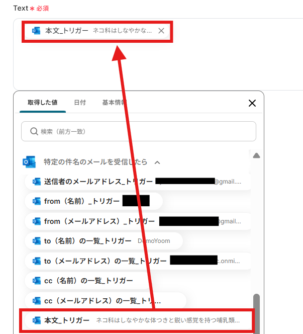 Textの部分は、前ステップで読み込んだメールの本文を、取得した値から入力してください。