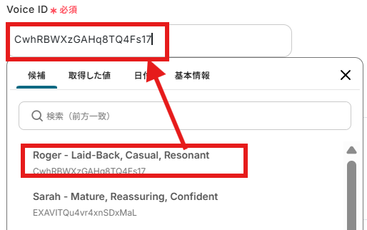ElevenLabsのVoice IDを候補より指定していきます。Voice IDとは、API連携やボイスクローンで特定の音声(声)を識別・指定するために使われる固有の文字列IDです。