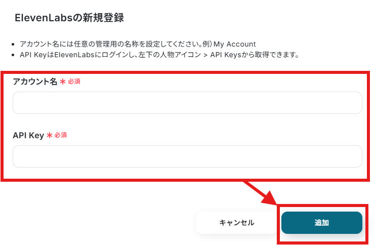 画面に表示されている注釈通り、アカウント名とAPIキーを入力します。