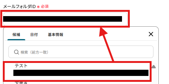 メールフォルダIDに、音声起こししたいメールを受信したフォルダを「候補」から指定していきます。