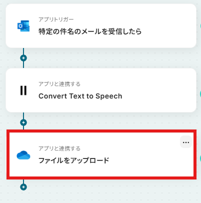 - 最後に、オペレーションでOneDriveの「ファイルをアップロード」アクションを設定し、生成された音声ファイルを指定のフォルダに格納します。