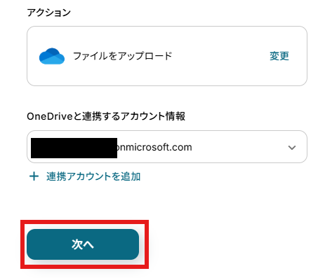 アクションはデフォルト設定のまま、アカウント情報は、連携したいアカウントが選択されているか確認してください。確認出来たら「次へ」をクリックしましょう。