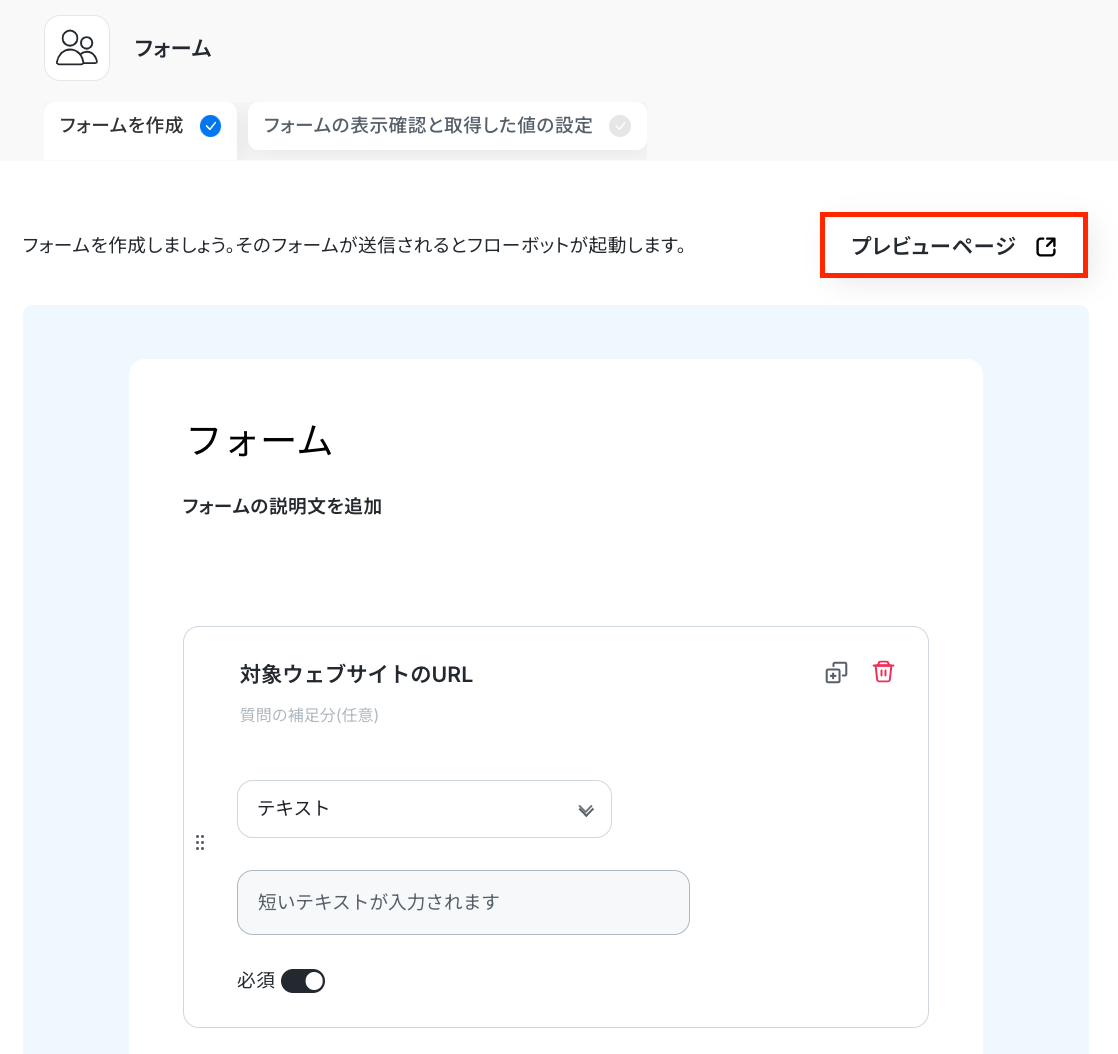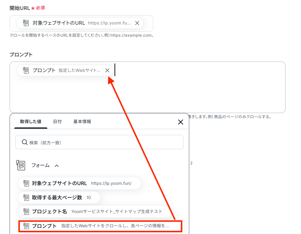 「開始URL」・「プロンプト」は、フォームトリガーの設定で取得した値から設定してください。