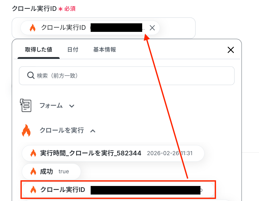 「クロールを実行」オペレーションで取得した値から選択してください。