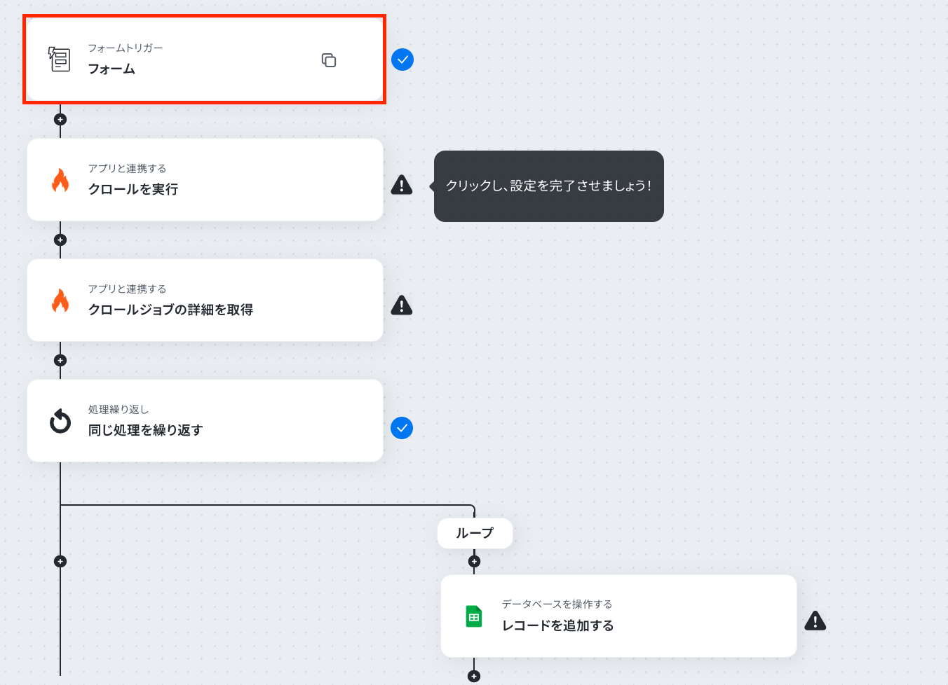 それではここから代表的な例として、フォームにURLが入力・送信されたら、FirecrawlでWebサイトをクロールし、結果をGoogle スプレッドシートにサイトマップとして自動で追加するフローを解説していきます!