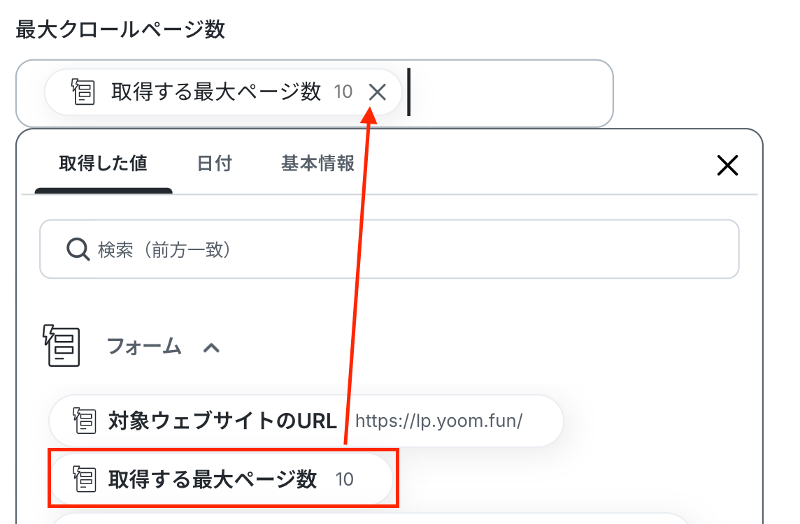 「最大クロールページ」も同様に、フォームトリガーの設定で取得した値から選択してください。