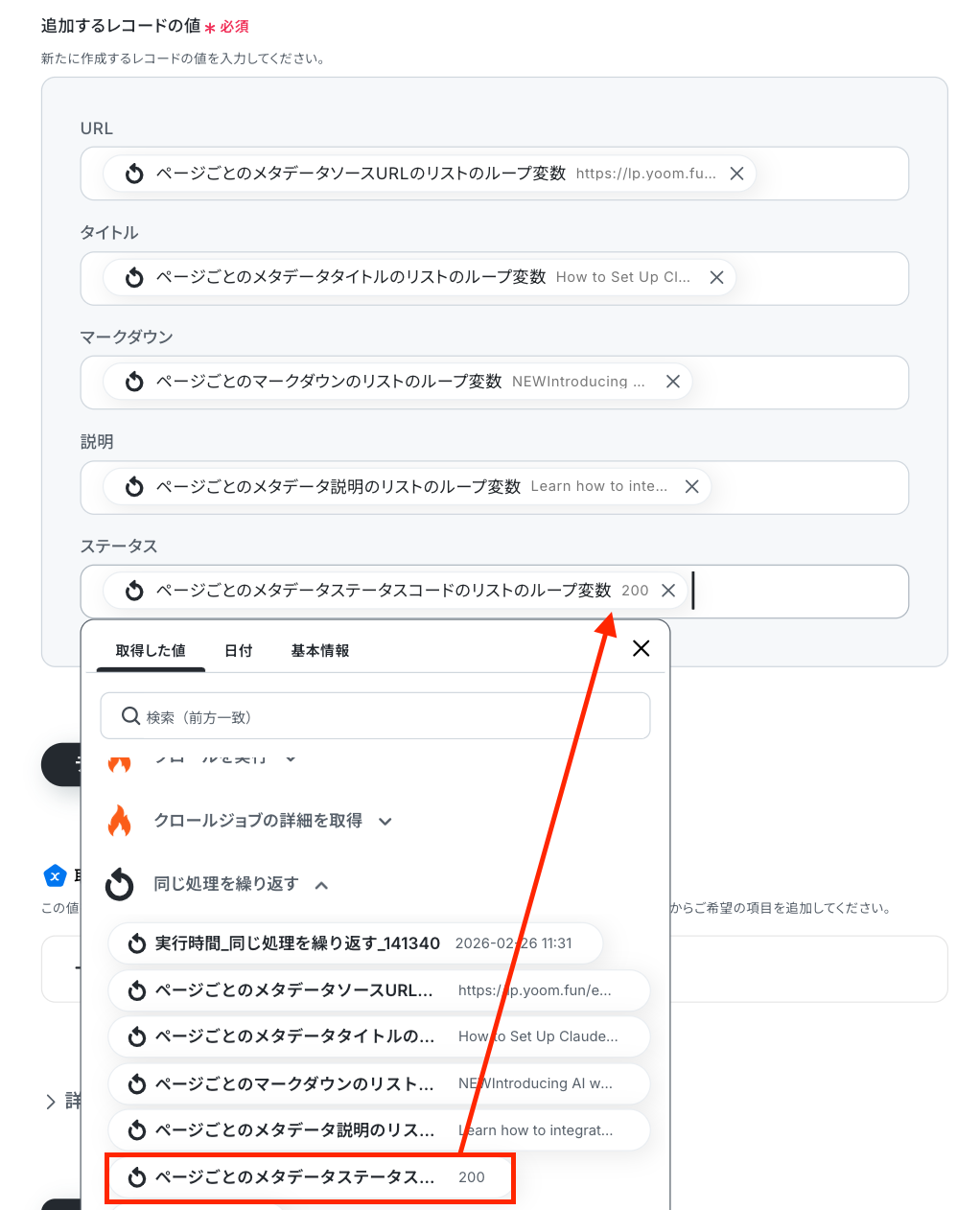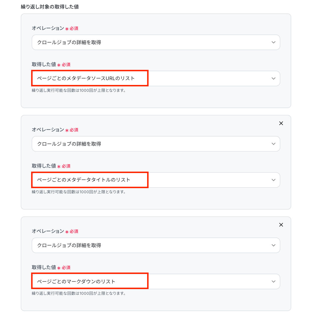 各項目には、繰り返し処理のオペレーションで取得した値を引用して設定してください。