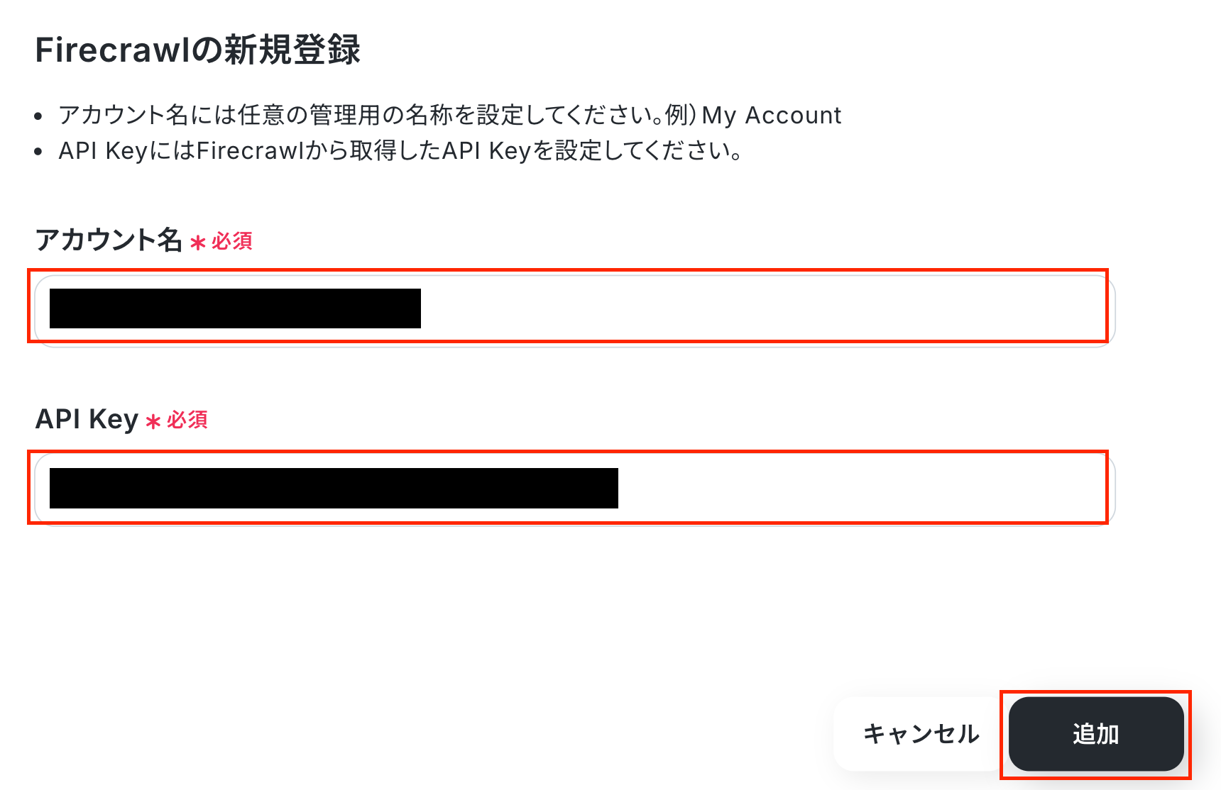 「API Key」は、Firecrawlから取得したAPI Keyを設定して、「追加」をクリックしてください。