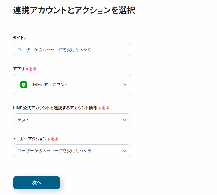 連携アカウントとアクションを選択する画面が表示されるので、タイトルは任意で変更してください。