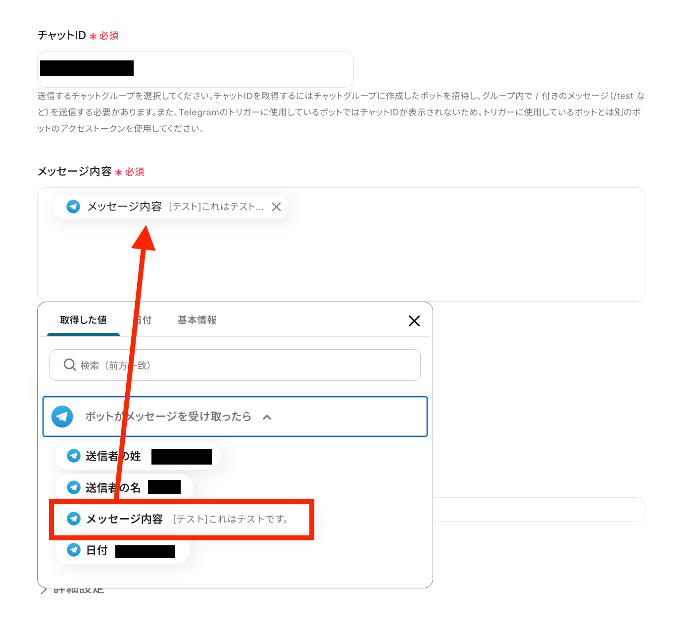 チャットIDは、トリガーで設定したものとは違うチャットを候補から選択してください。 候補が表示されない場合、該当のチャットに「/」付きのメッセージを送ると表示されます。※ボット自身のメッセージを再検知して、無限ループが発生するため。 メッセージ内容を先ほど取得した値を活用して設定します。 取得した値を利用することで、トリガーが起動するたびに最新の値を自動で引用できます。