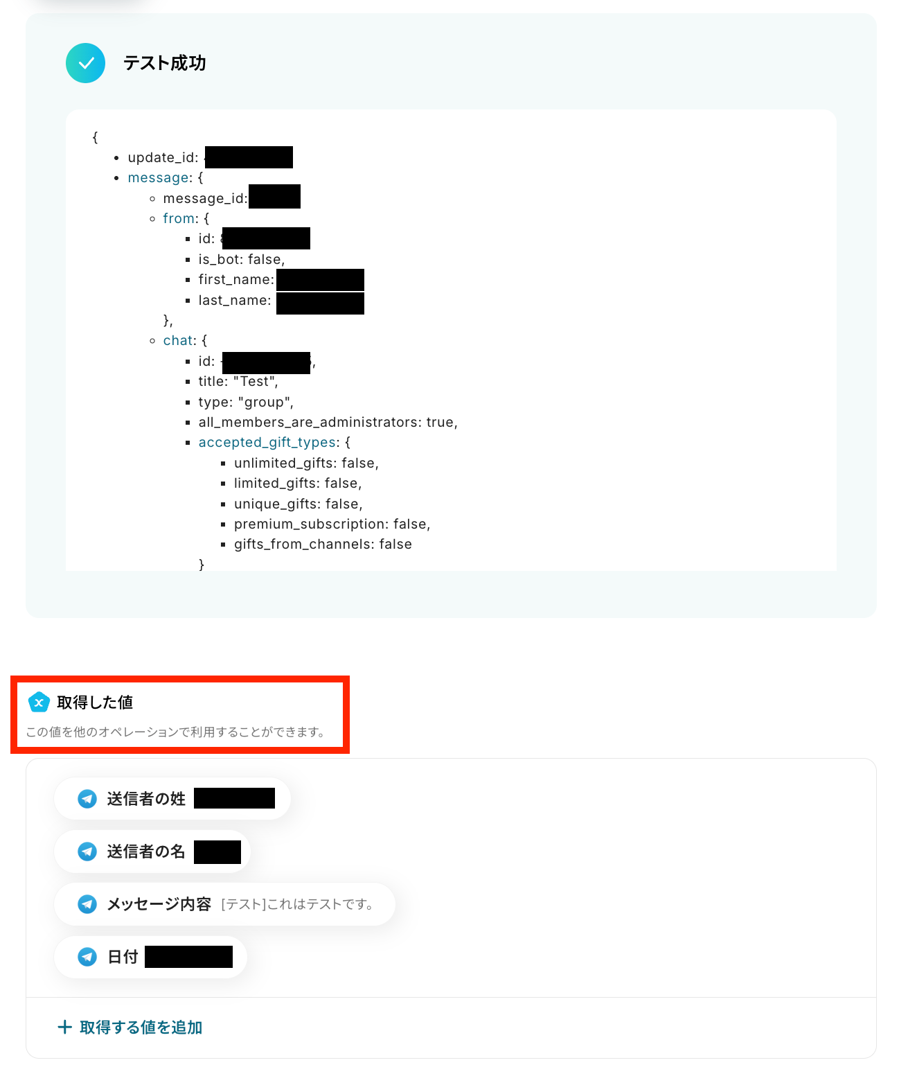 「テスト成功」と表示が出たら、取得した値 に値が反映されます。 ※取得した値 とは? トリガーやオペレーション設定時に、「テスト」を実行して取得した値のことを指します。 後続のオペレーション設定時の値として利用でき、フローボットを起動する度に変動した値となります。