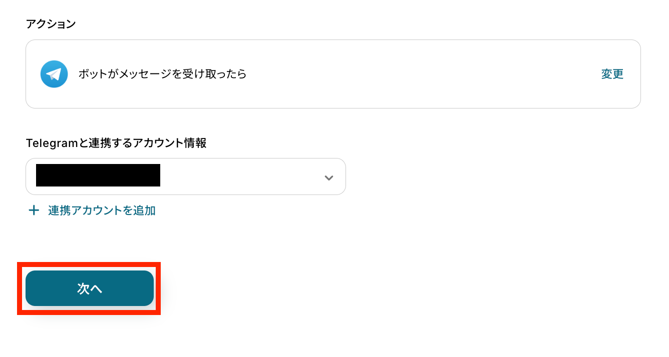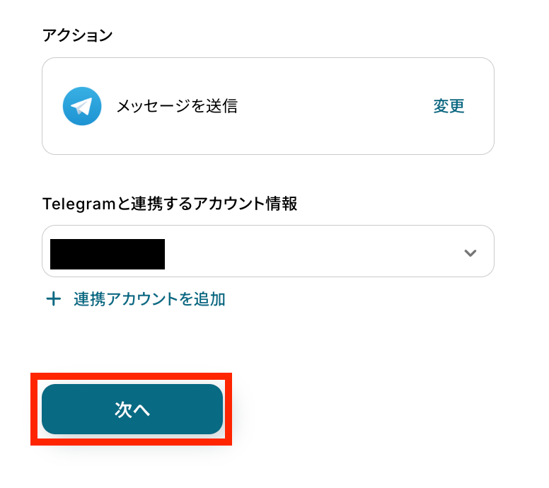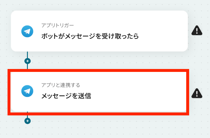 ステップ4:Telegramのアクション設定 次に、取得した値を利用して、TelegramでEchoメッセージを送信する設定を行います。