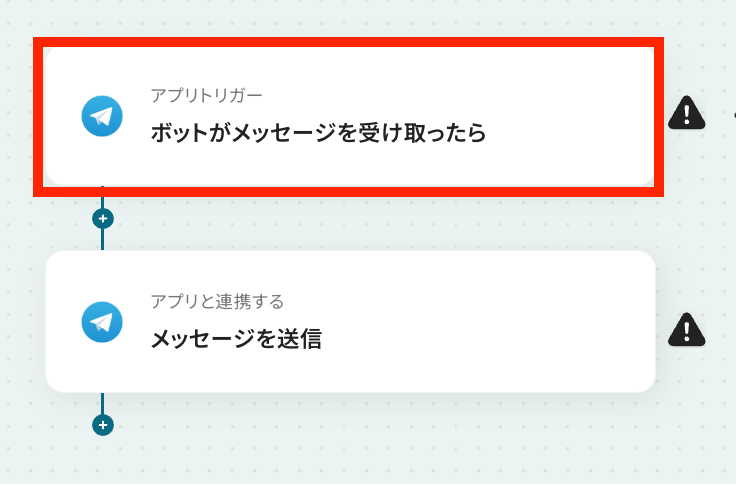 はじめに、TelegramをYoomと連携します。 次に、トリガーでTelegramを選択し、「ボットがメッセージを受け取ったら」というアクションを設定します。 最後に、オペレーションでTelegramの「メッセージを送信」アクションを設定し、トリガーで受け取ったメッセージ内容をそのまま送信するように設定します。 ※「トリガー」:フロー起動のきっかけとなるアクション、「オペレーション」:トリガー起動後、フロー内で処理を行うアクション■このワークフローのカスタムポイント