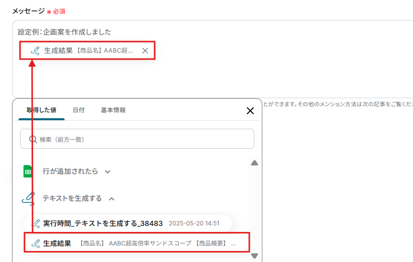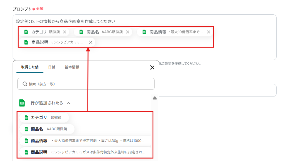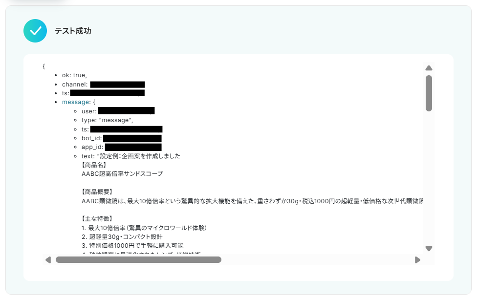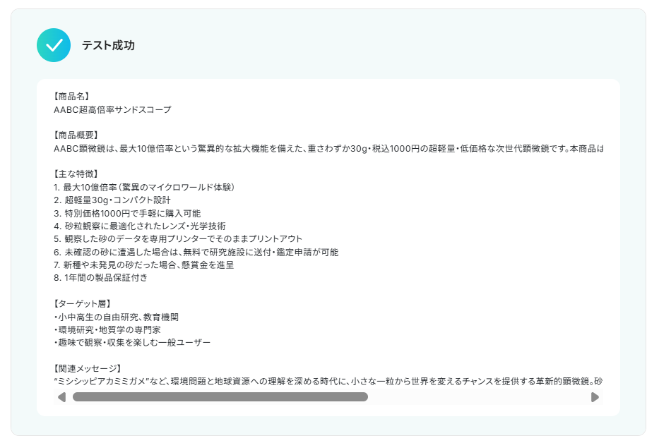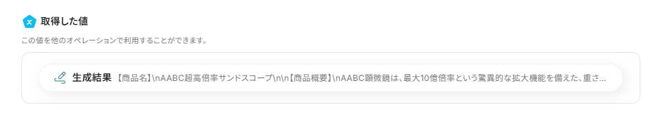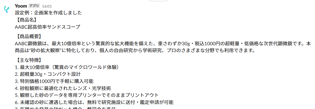 新しい商品情報がGoogle スプレッドシートに入力されると、AIが自動的に企画案を生成し、チームに共有します。この自動化により、企画の立案が迅速かつ効率的に行えるようになります。