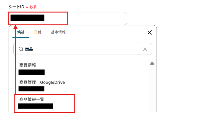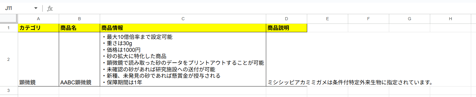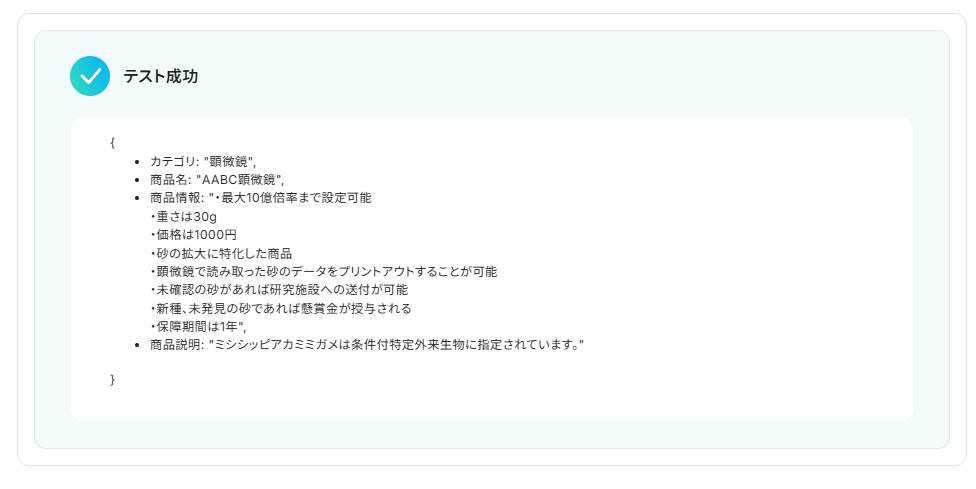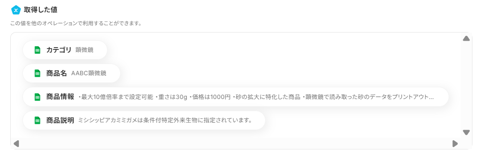 情報として、先ほどの設定で取得した値からカテゴリ、商品名、商品情報、商品説明の4つを入力しました。