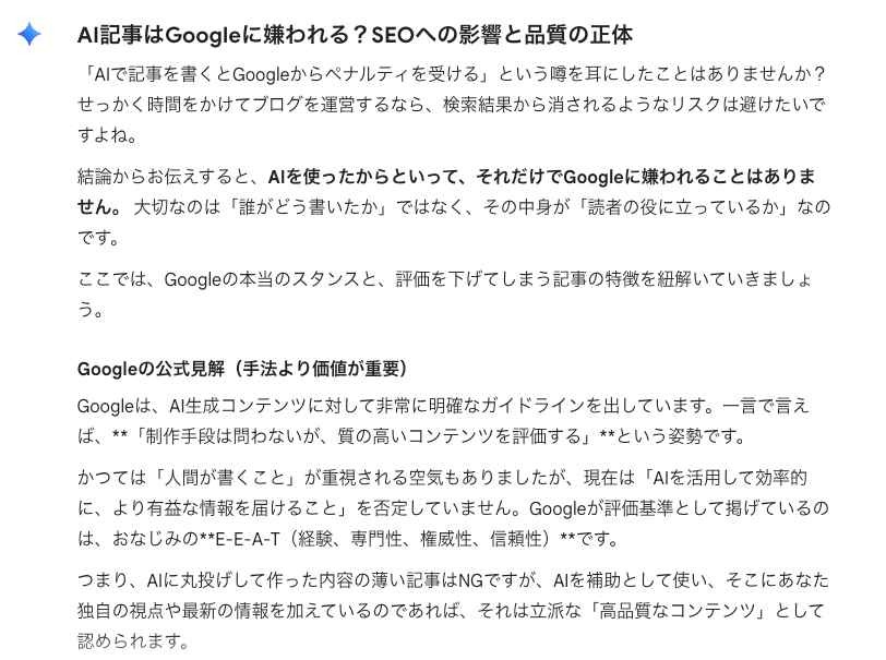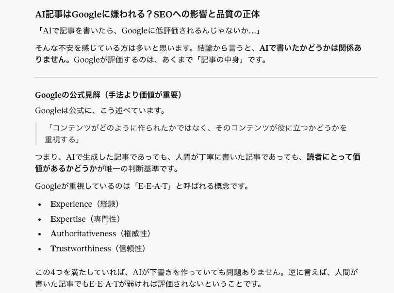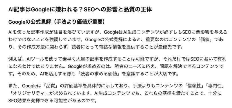 H2:AI記事はGoogleに嫌われる?SEOへの影響と品質の正体 H3:Googleの公式見解(手法より価値が重要) H3:低品質と判定されるAI記事の共通点