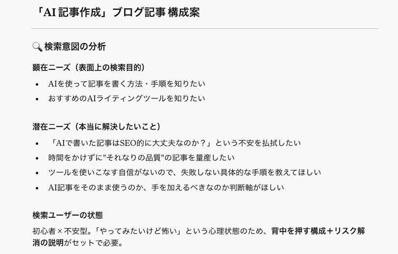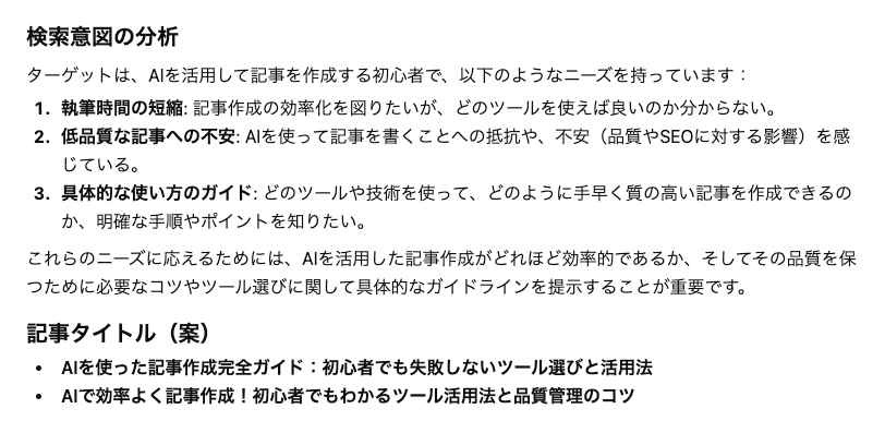 これらの専用ツールは、SEOに必要な見出し構成や関連キーワードの網羅性をシステム側でサポートしてくれるため、プロンプト作りに慣れていない初心者でも記事を作りやすいのが魅力です。