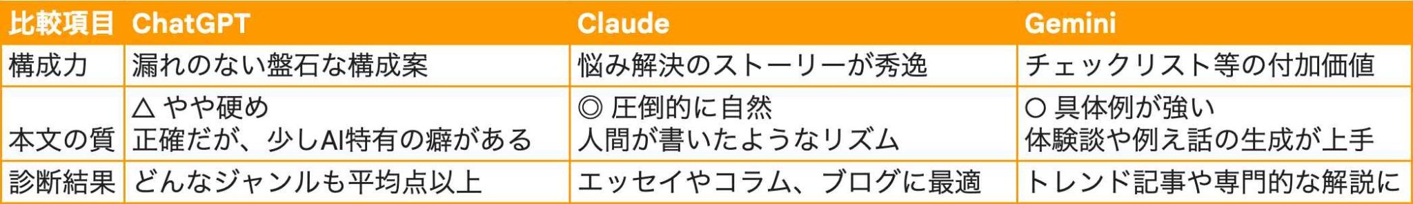 視認性は三者とも優秀ですが、読み味の軽快さではClaude、具体例の説得力ではGemini、情報の整理力ではChatGPTが光ります。
