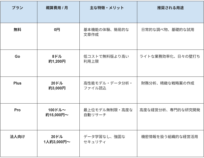 コストをかけずにChatGPTの基礎的な機能を体験できますが、高性能モデルの利用回数や処理能力には上限があるため、本格的な経営分析や大量のデータ処理には不向きな場合があります。 - Goプラン(8ドル(約1,200円程度)/月)