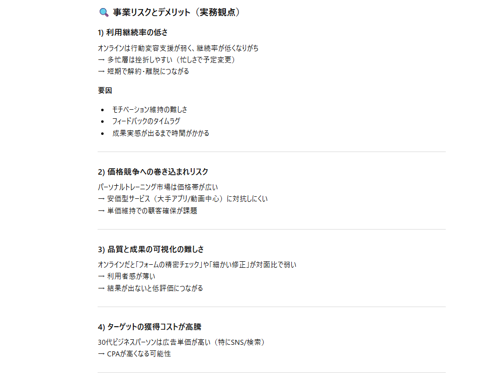 オンラインのパーソナルトレーニング事業の立ち上げを検討しています。この経営戦略について壁打ちをしてください。ターゲット層は30代の多忙なビジネスパーソンです。想定されるリスク、デメリット、および既存の競合サービスに対する差別化の改善点を徹底的に洗い出してください。