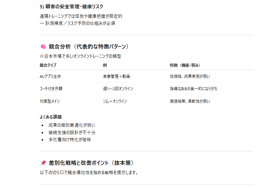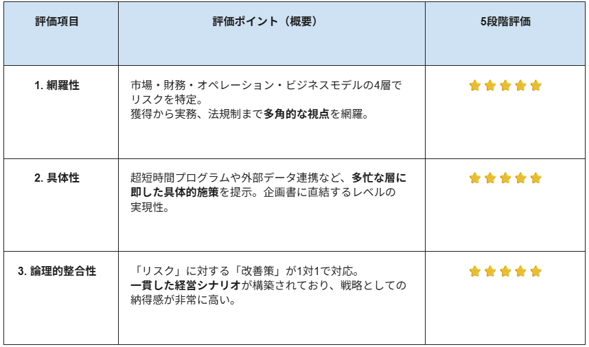 前半で洗い出したリスクに対し、後半の差別化戦略が「アンサー」として論理的に機能しており、戦略としての納得感が非常に高いです。