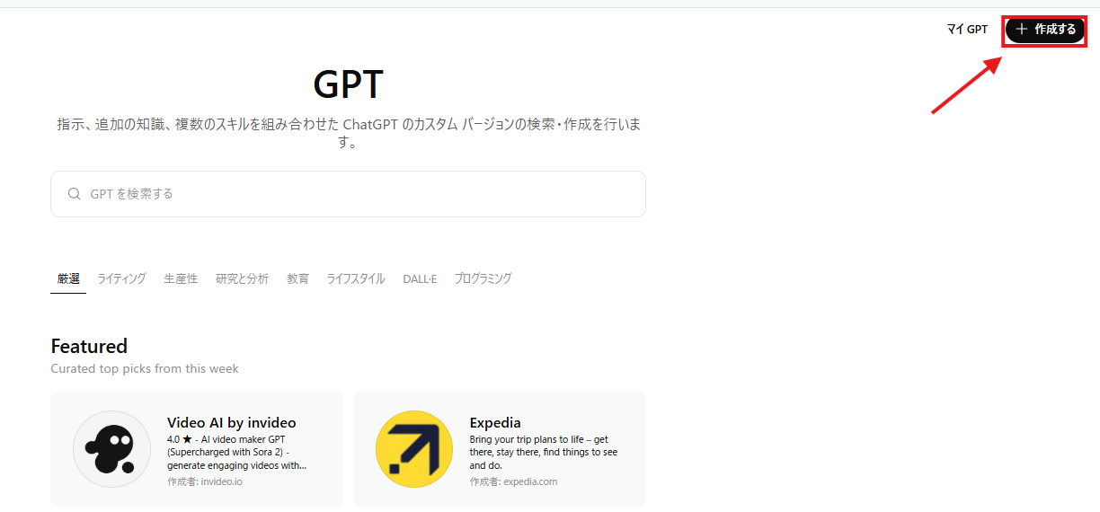 3.GPTsを作成する方法は、ChatGPTと会話しながらGPTsを作る方法と指示プロンプトなどをあらかじめ入れてGPTsを作る方法の2つあります。今回は、ChatGPTと会話しながらGPTsを作る方法で作成します。