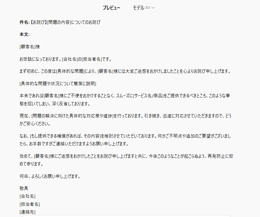 一方で、特に厳密に指定していなかったメール末尾の署名欄については、文脈に合わせて適切な形式で自動生成されるという柔軟さも見られました。