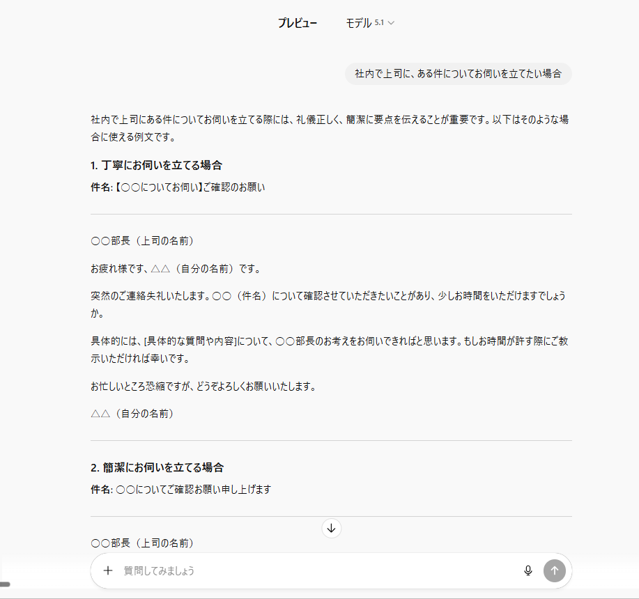 生成された文章は日本語として自然ではあるものの、ビジネスの文脈(シチュエーション)がズレているため、そのままでは使えないものが目立つ印象です。 例えば「お時間くださいメール」を生成させたところ、「突然のご連絡をお許しください」から始まる、まるで新規営業のような他人行儀な書き出しになってしまいました。
