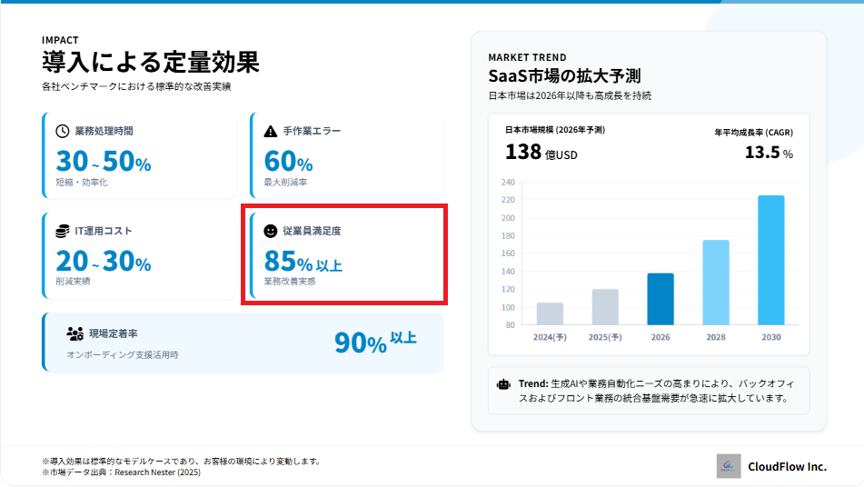 条件として、企業ロゴの配置、BtoB向けの落ち着いたトーン、そして「表紙」と「導入効果(定量的な効果イメージとSaaS市場の現状)」という具体的なページ構成を指定しました。