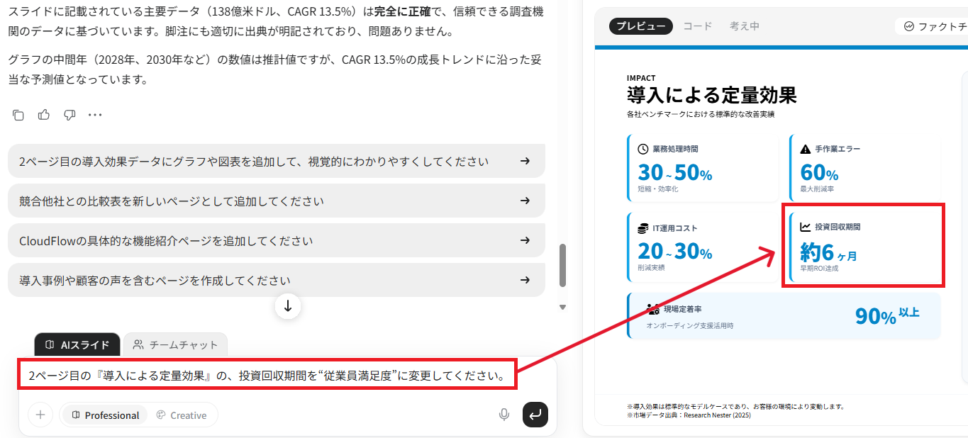 具体的には「導入による定量効果」のページにおいて、項目の変更をテキストで命令し、手動操作なしでどこまで意図が伝わるかを試します。