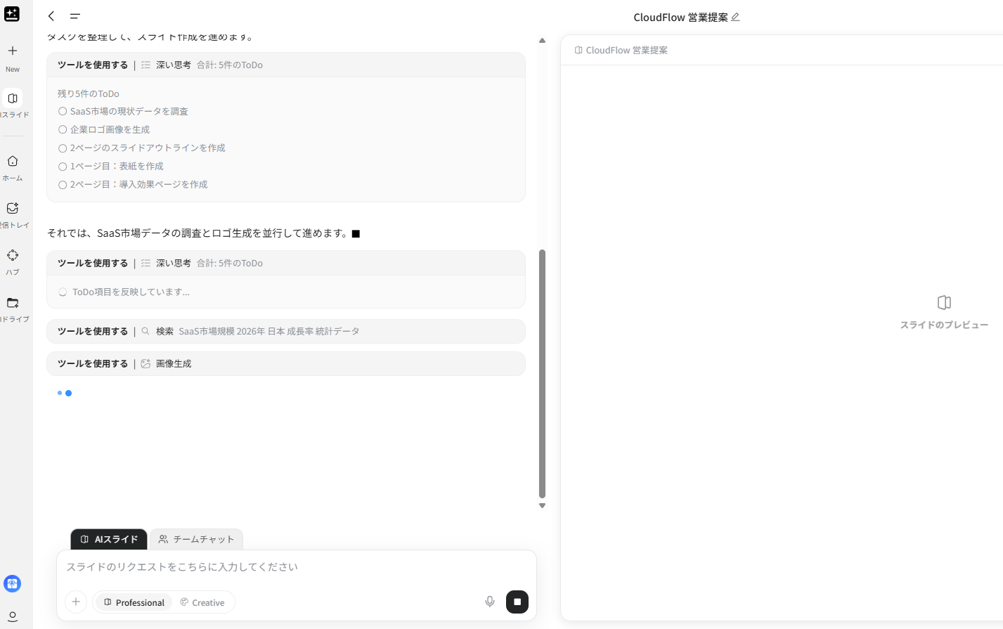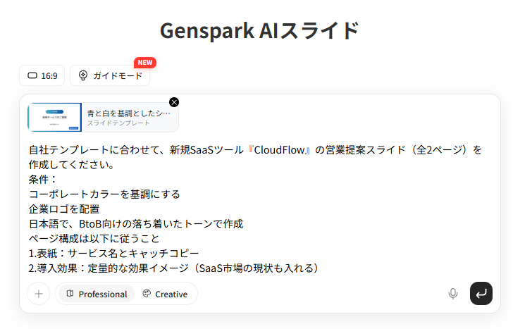 その上で、新規SaaSツール『CloudFlow』の営業提案スライド全2ページの作成を指示。
