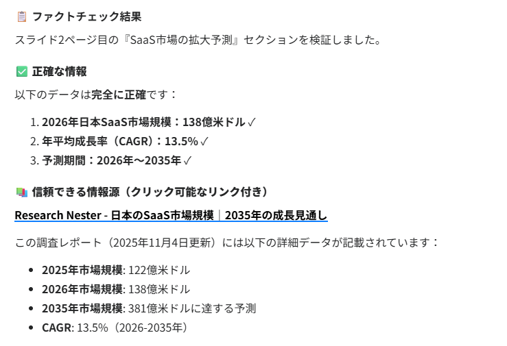 次に、生成されたスライド内の「SaaS市場の拡大予測」というデータに対し、Gensparkのファクトチェック機能を実行しました。