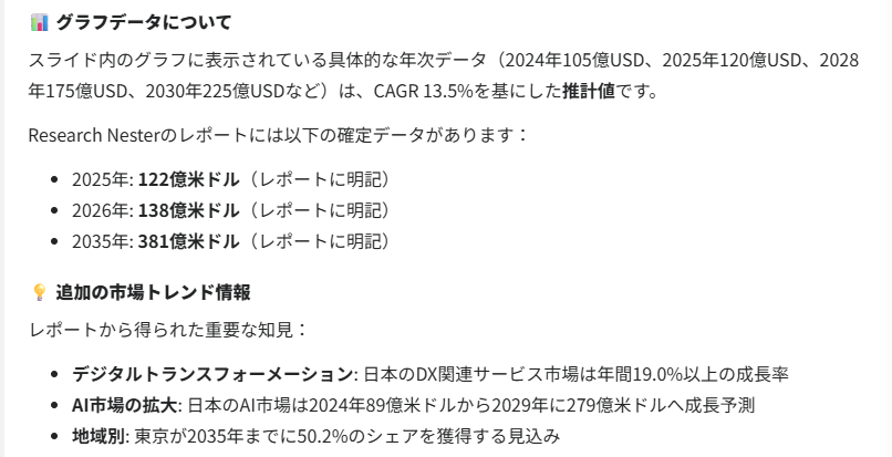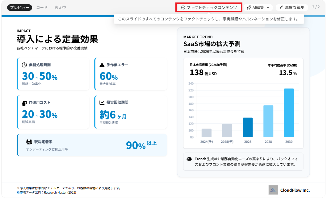 ビジネスの意思決定に使われる資料において、データの正確性は命です。このファクトチェック機能があることで、AIが作った資料を安心して実務に投入できるのです。
