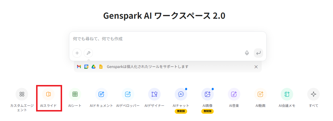 まずはGensparkの公式サイトにアクセスし、Googleアカウントなどを利用して会員登録を行います。ログイン後のダッシュボード画面には検索バーが表示されていますが、スライドを作成する場合は、メニューから「AIスライド」を選択して専用モードを起動します。