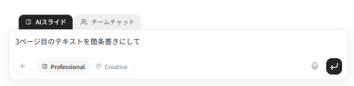 画面上のチャットインターフェースから「3ページ目のテキストを箇条書きにして」「もっと専門用語を噛み砕いて説明して」「新しいスライドを追加して〇〇のデータをいれて」とテキストで指示を出すだけで、AIがレイアウトを維持したまま即座に再生成してくれます。