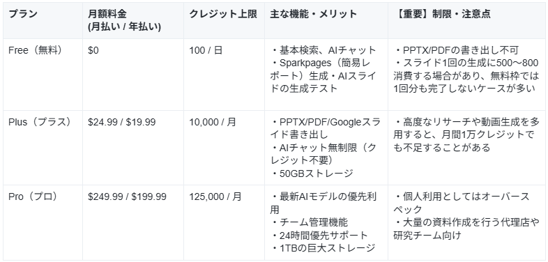 実務利用なら有料プランを推奨:日常的にスライドを作成・ダウンロードして利用する場合は、月間10,000クレジットが付与される有料プラン(Plusプラン:月額約20ドル〜)の検討が現実的です。これなら、1ヶ月に10〜20件程度の高品質なプレゼン資料を安定して作成できます。