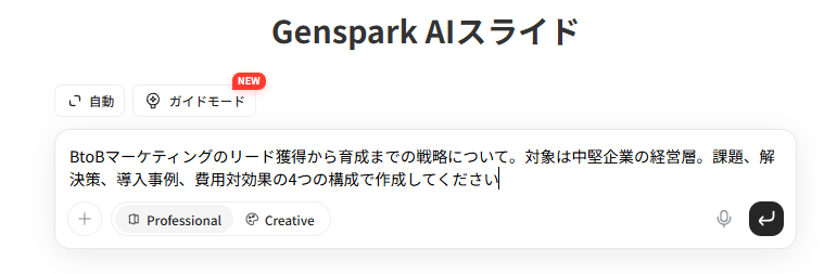 画面中央の入力ボックスに、作成したいスライドのテーマや構成の指示(プロンプト)を入力します。