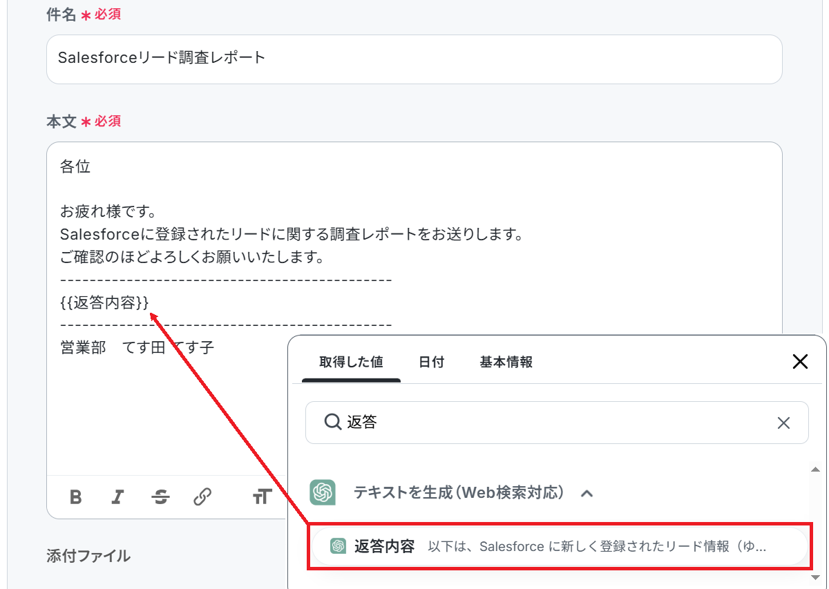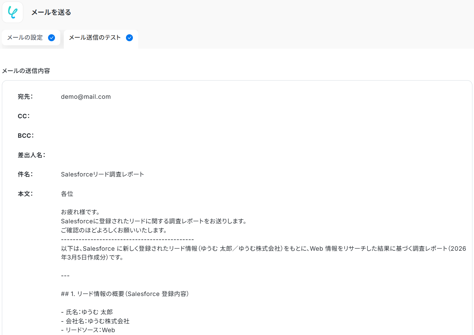 先ほどChatGPTが生成したリード調査レポートをYoomのメール機能で送付します。