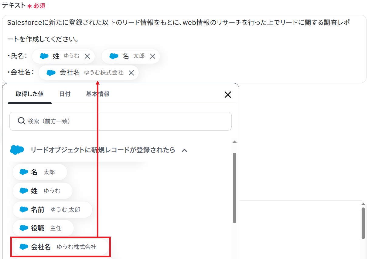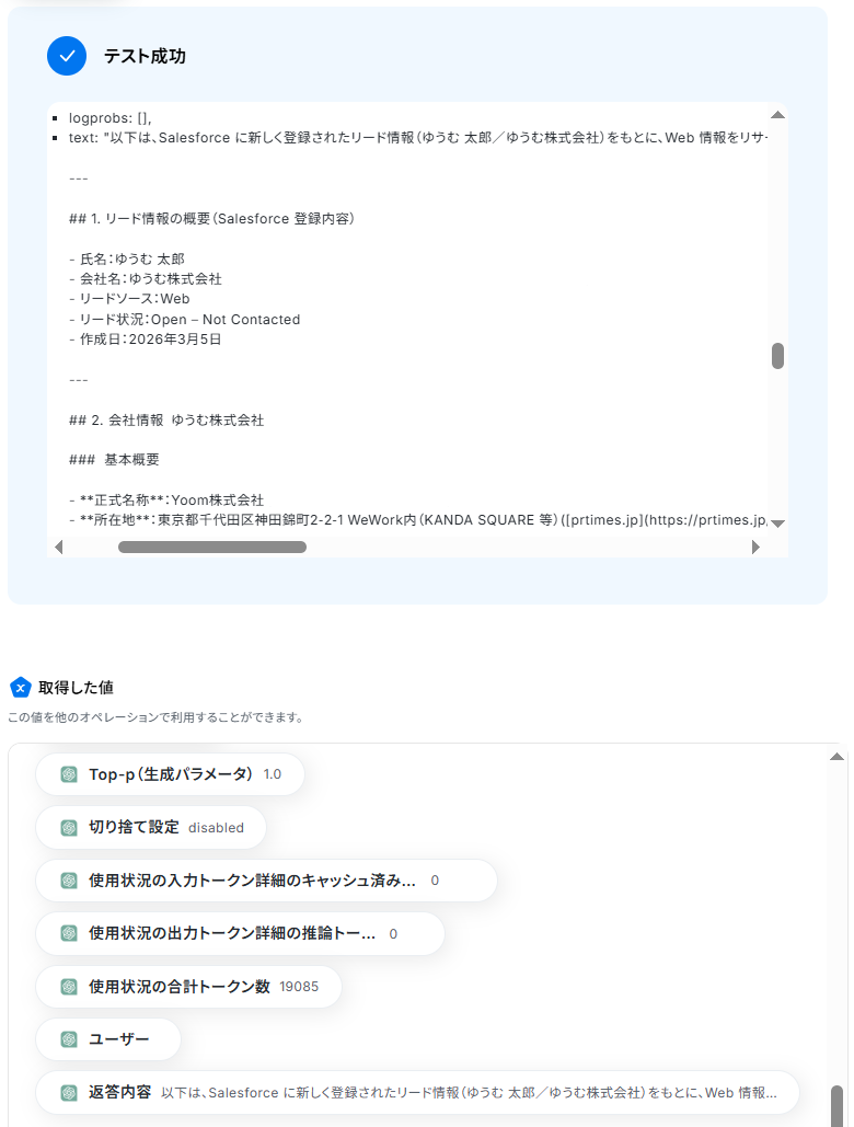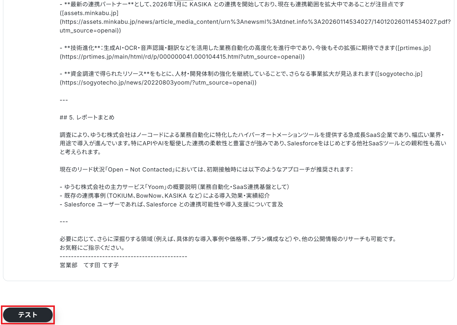 先ほど取得したSalesforceのリード情報をもとにChatGPTでWeb検索を行い、調査レポートを生成します。「テキストを生成(Web検索対応)」をクリックしてください。