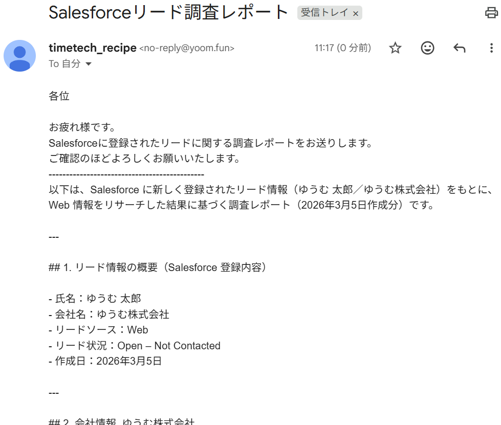 Yoomのアドレスから、ChatGPTによるリード調査レポートが送信されました!